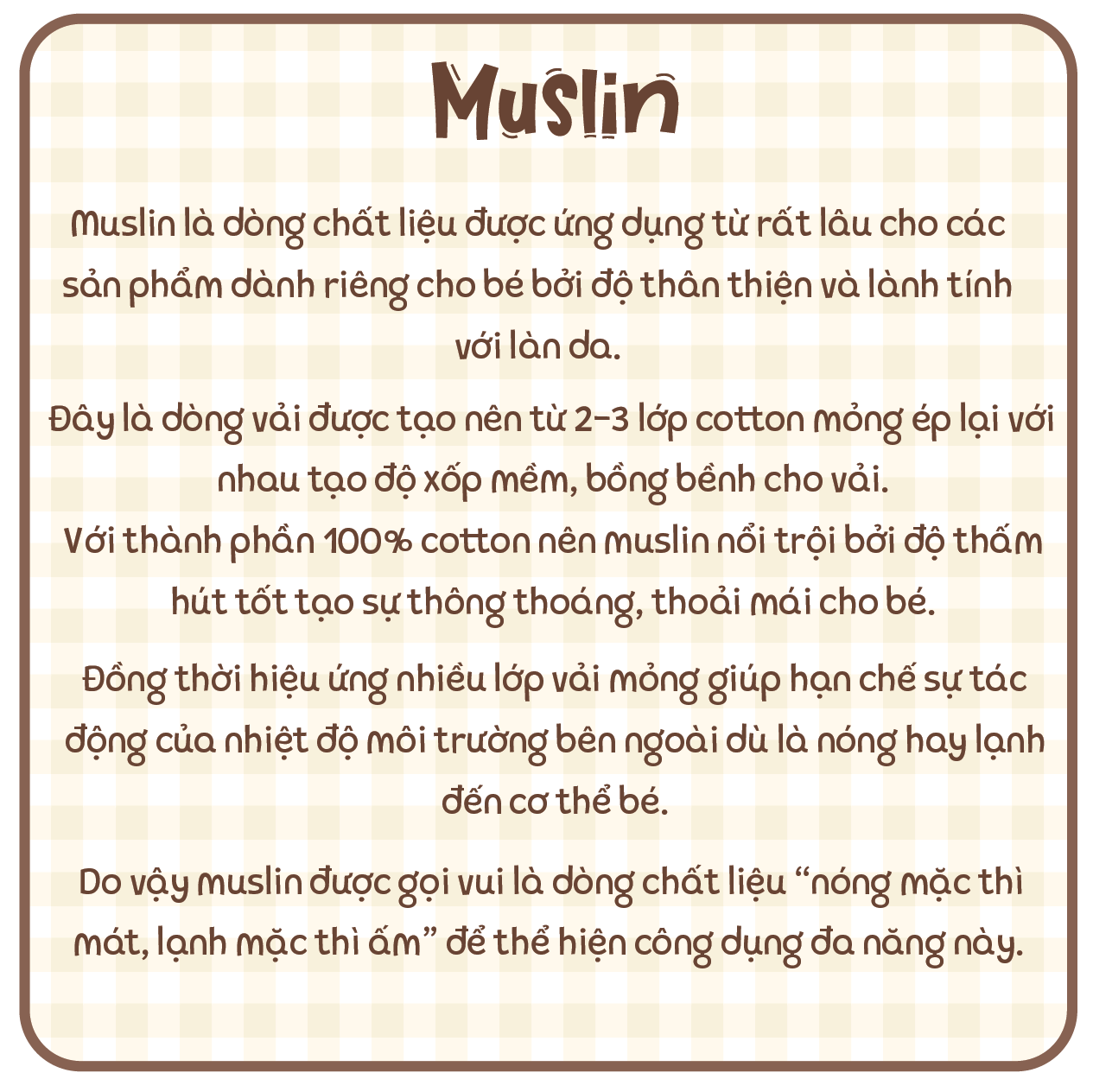 🌵 𝑪𝒉𝒂̂́𝒕 𝒍𝒊𝒆̣̂𝒖 𝒗𝒂̉𝒊: - Trên nền chất liệu vải muslin 100% cotton thiên nhiên mềm mịn, êm ái và thường loại vải này sẽ nhẹ hơn so với các loại vải khác nên sẽ tạo cho bé cảm giác rất thoải mái khi mặc.